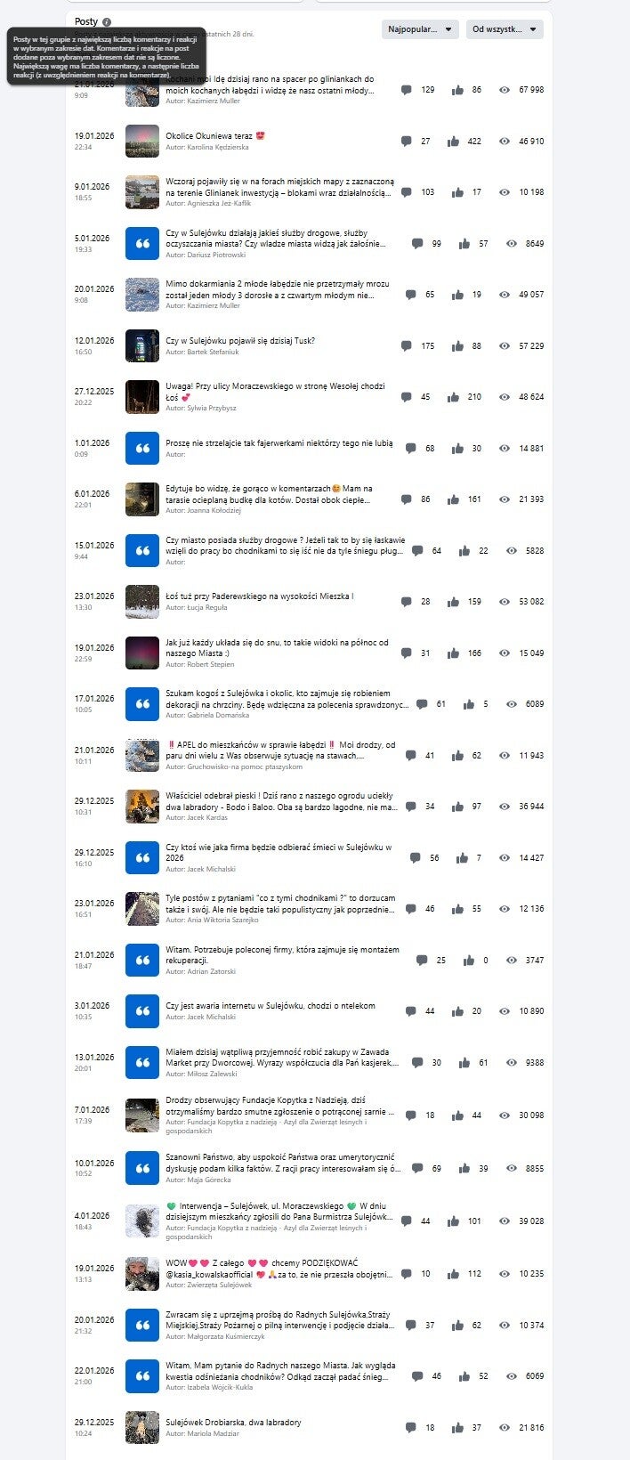 Powyższe statystyki to printscreny z menu administratora z dnia 25 stycznia 2026r. W ostatnich dwóch tabelach widać statystyki najbardziej popularnych tematów, ilość wpisów w danym temacie, ilość lajków i reakcji, a także liczbę wyświetleń.