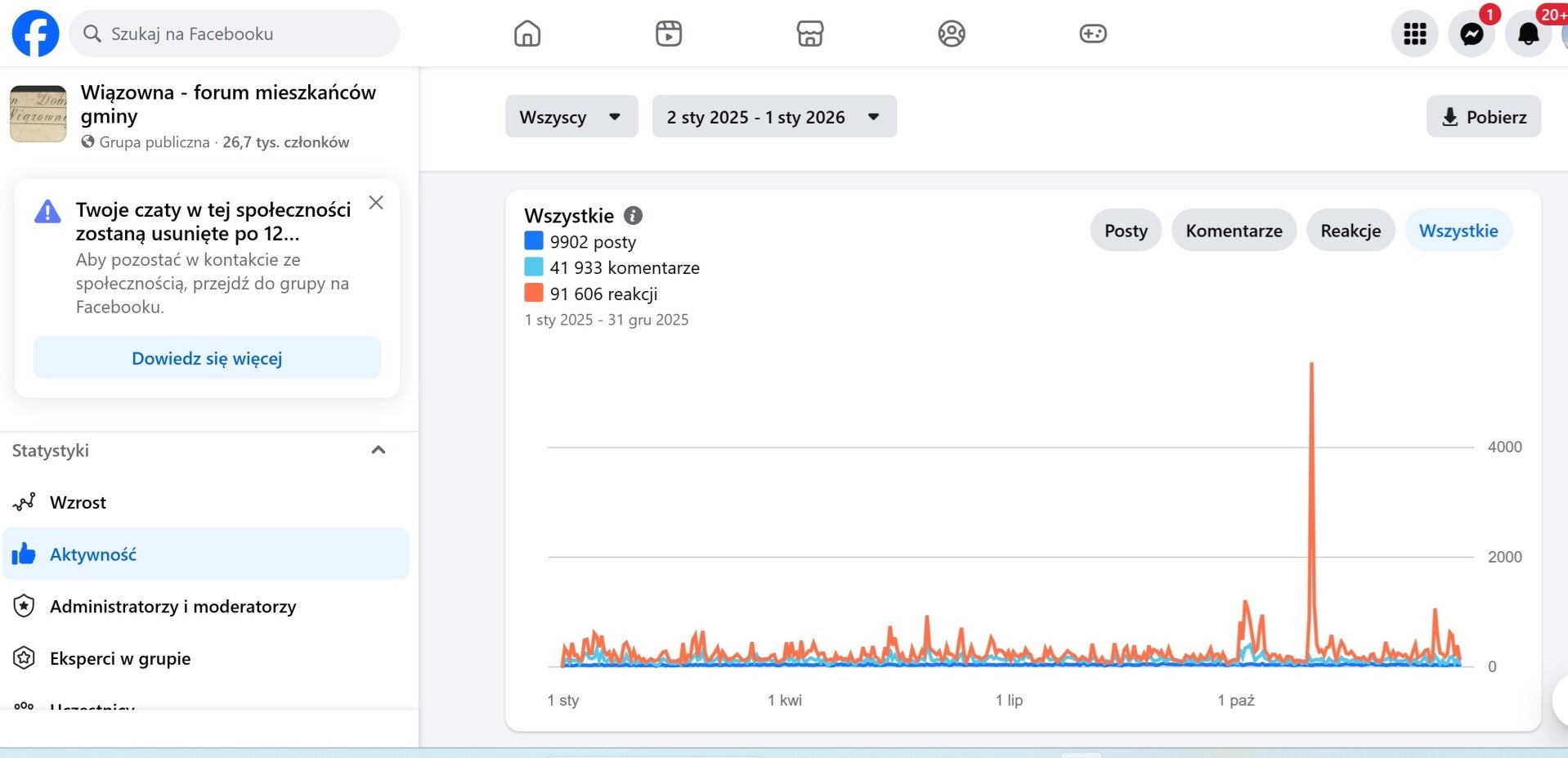 Powyższe statystyki to printscreny z menu administratora z dnia 25 stycznia 2026r. W ostatnich dwóch tabelach widać statystyki najbardziej popularnych tematów, ilość wpisów w danym temacie, ilość lajków i reakcji, a także liczbę wyświetleń.