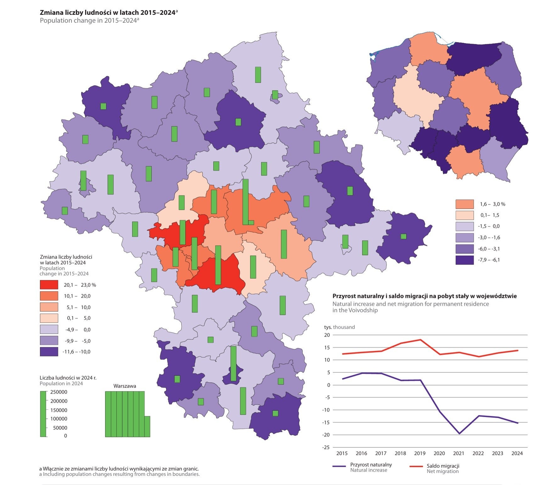 Stan i ruch naturalny ludności w województwie mazowieckim w 2021 i 2024 r. Raport i dane z GUS: