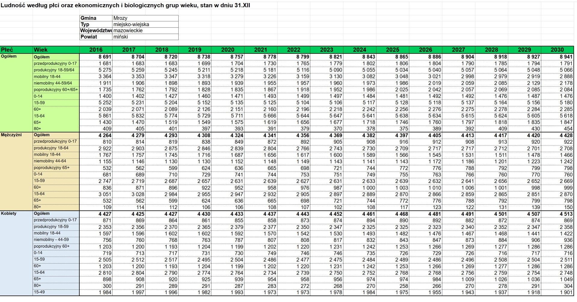 Gmina Mrozy to jeden z najszybciej rozwijających się obszarów w regionie, co potwierdzają twarde dane Głównego Urzędu Statystycznego. Powyższa tabela wskazuje na stały trend utrzymania liczby mieszkańców na tym samym poziomie, który według prognoz GUS utrzyma się co najmniej do 2030 roku.