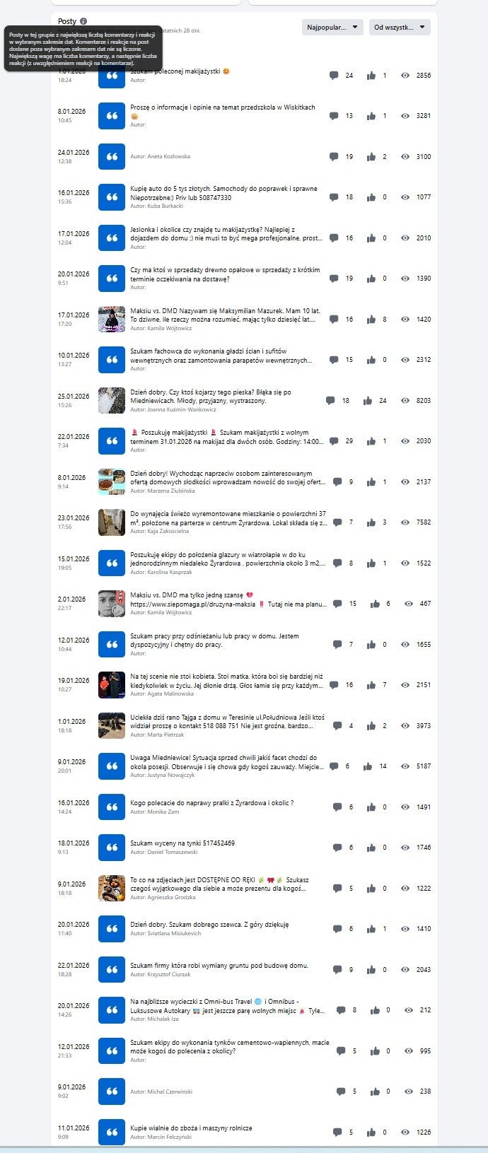 Powyższe statystyki to printscreny z menu administratora z dnia 27 stycznia 2026r. W ostatnich dwóch tabelach widać statystyki najbardziej popularnych tematów, ilość wpisów w danym temacie, ilość lajków i reakcji, a także liczbę wyświetleń.